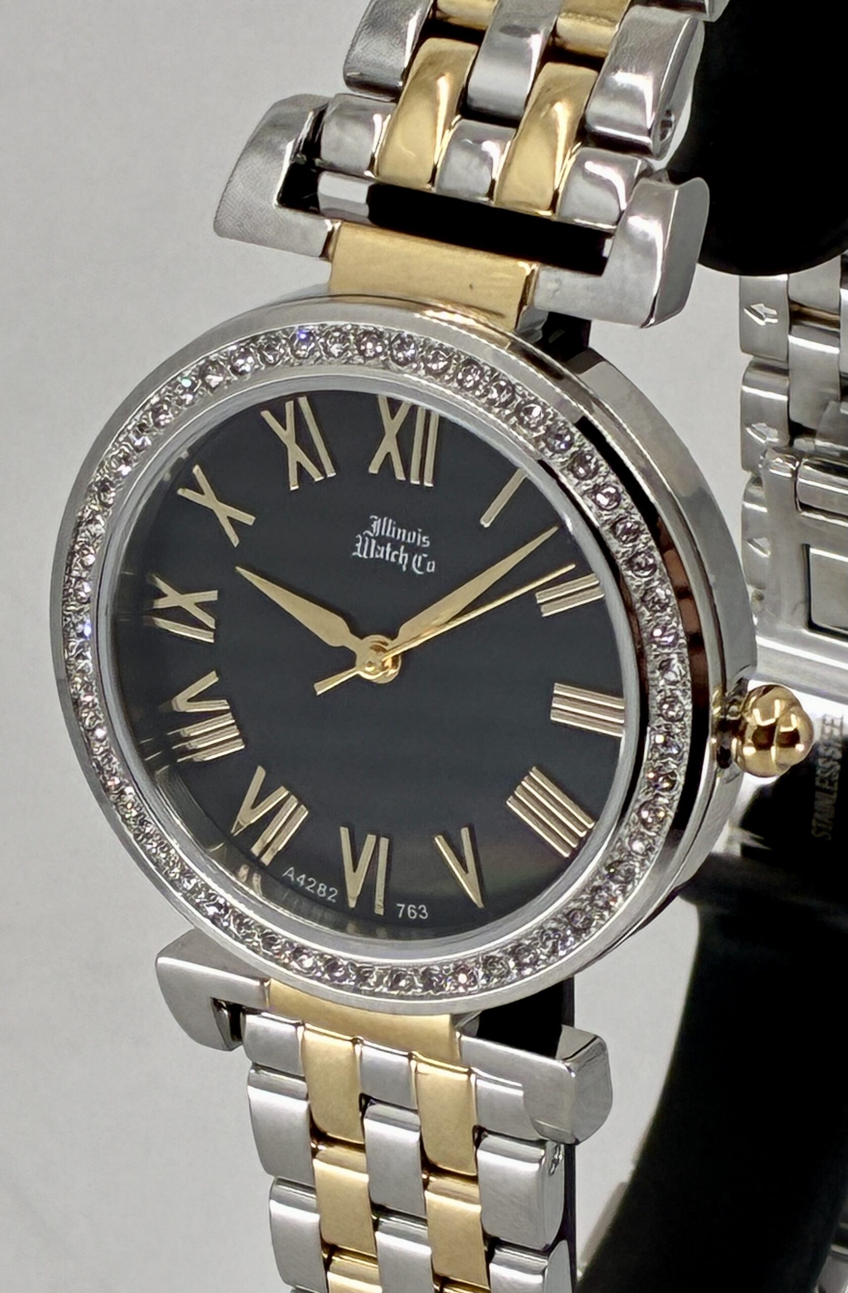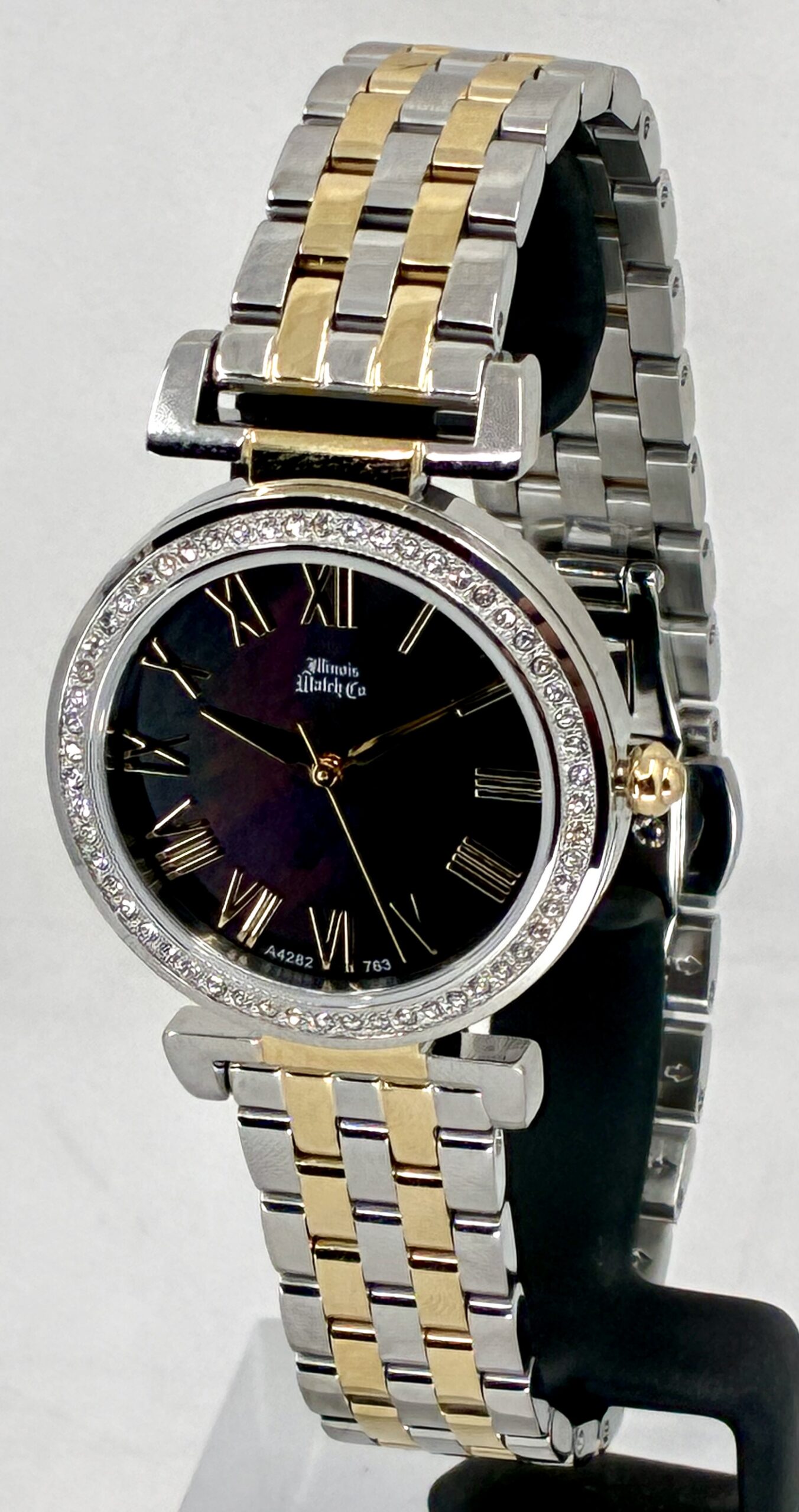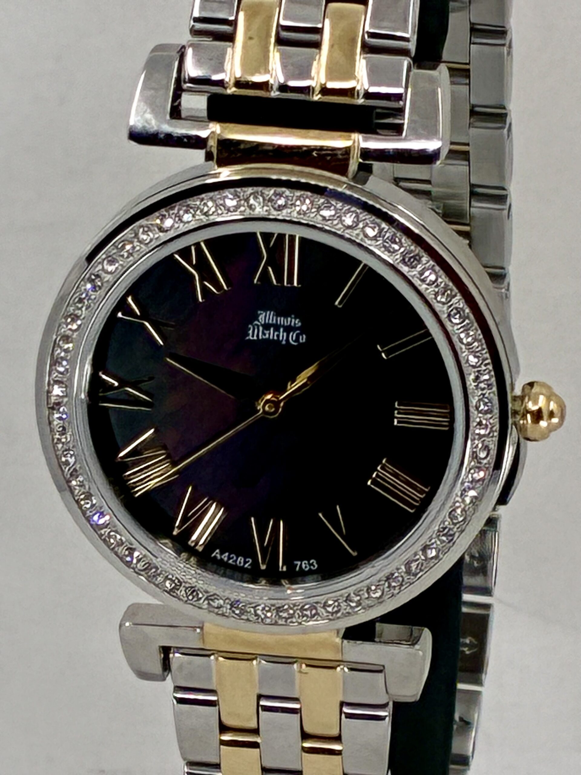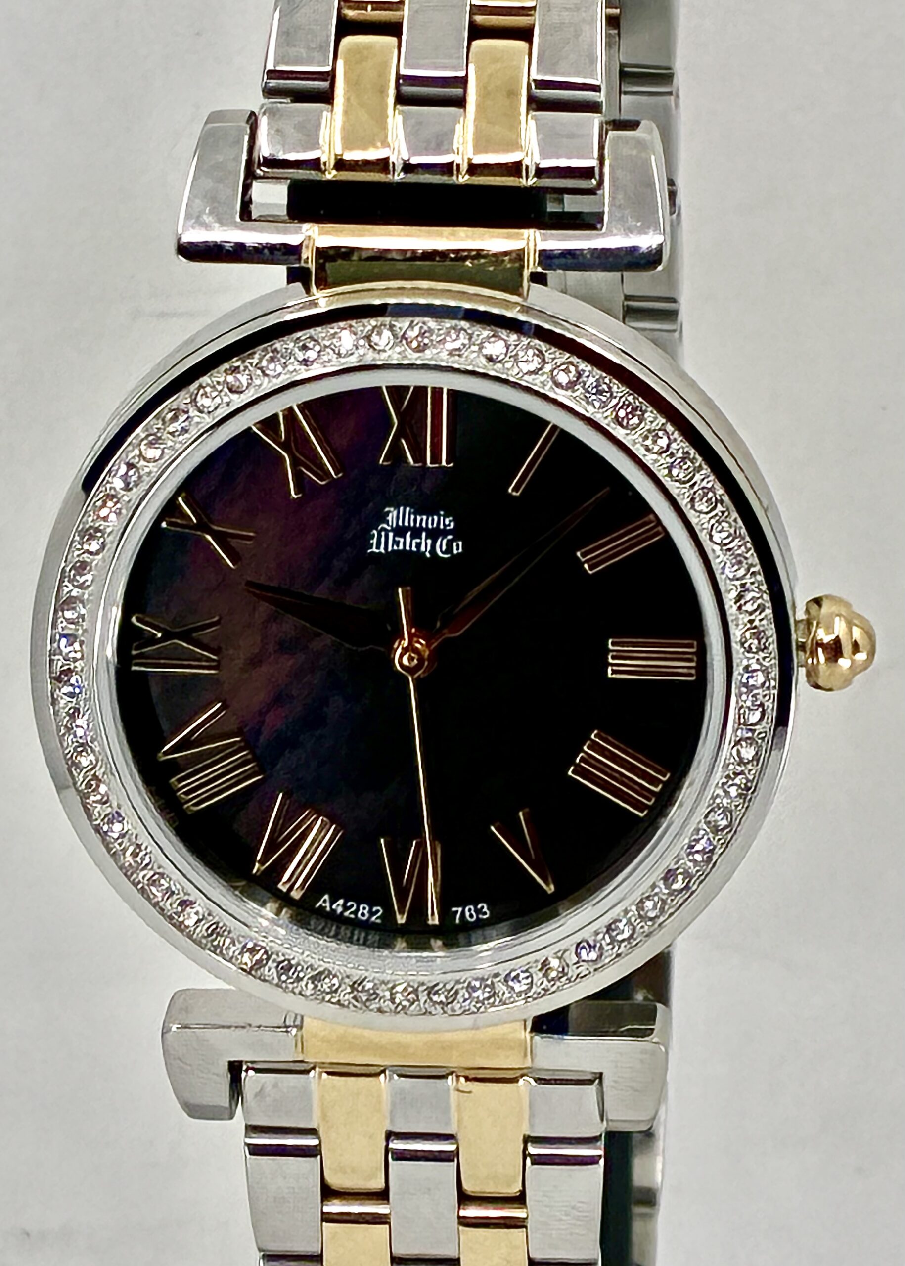 The Illinois Watch Company presents a masterclass in light and texture. This 32mm timepiece is centered around a genuine black mother-of-pearl dial, offering a deep, iridescent shimmer that ensures your watch is a one-of-a-kind original. The stainless steel case is elegantly framed by 56 crystals, catching the light with every movement.